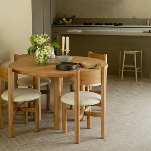 Made of solid White Oak wood, the Topa Topa Round Dining Table is designed to bring a playful look to your space. The round shape encourages laughter and conversation, making every gathering feel special.