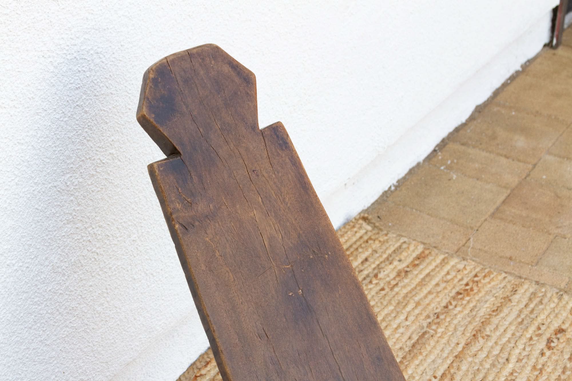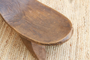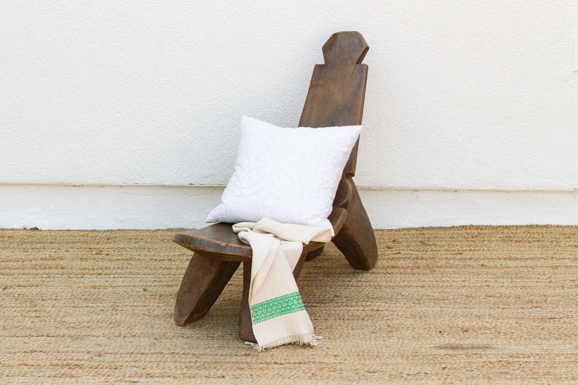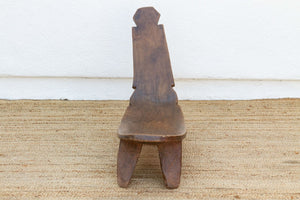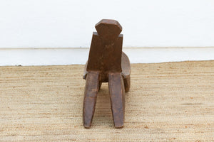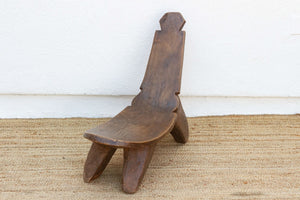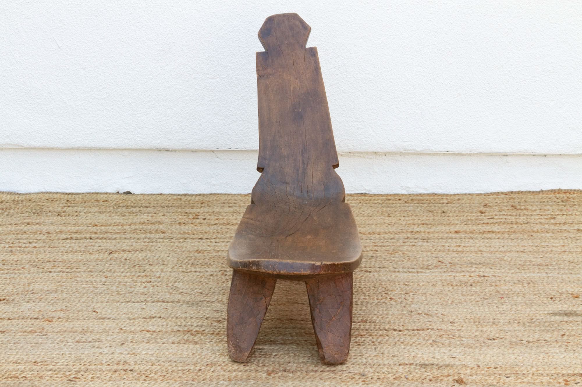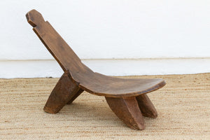 A lovely artifact, this primitive chair was carved for the "Noble" in the Lobi tribe. This piece is beautifully carved from a large log of wood. This chair sits low to the ground and is an example of African primitive yet aesthetic design. It features four robust cone shaped legs with a stylish carved design. Ideal for use a lounge chair indoor or outdoor or as statement accessory in a room. Please note: chair is an antique is slightly uneven.
