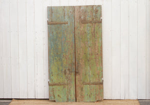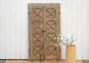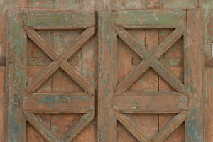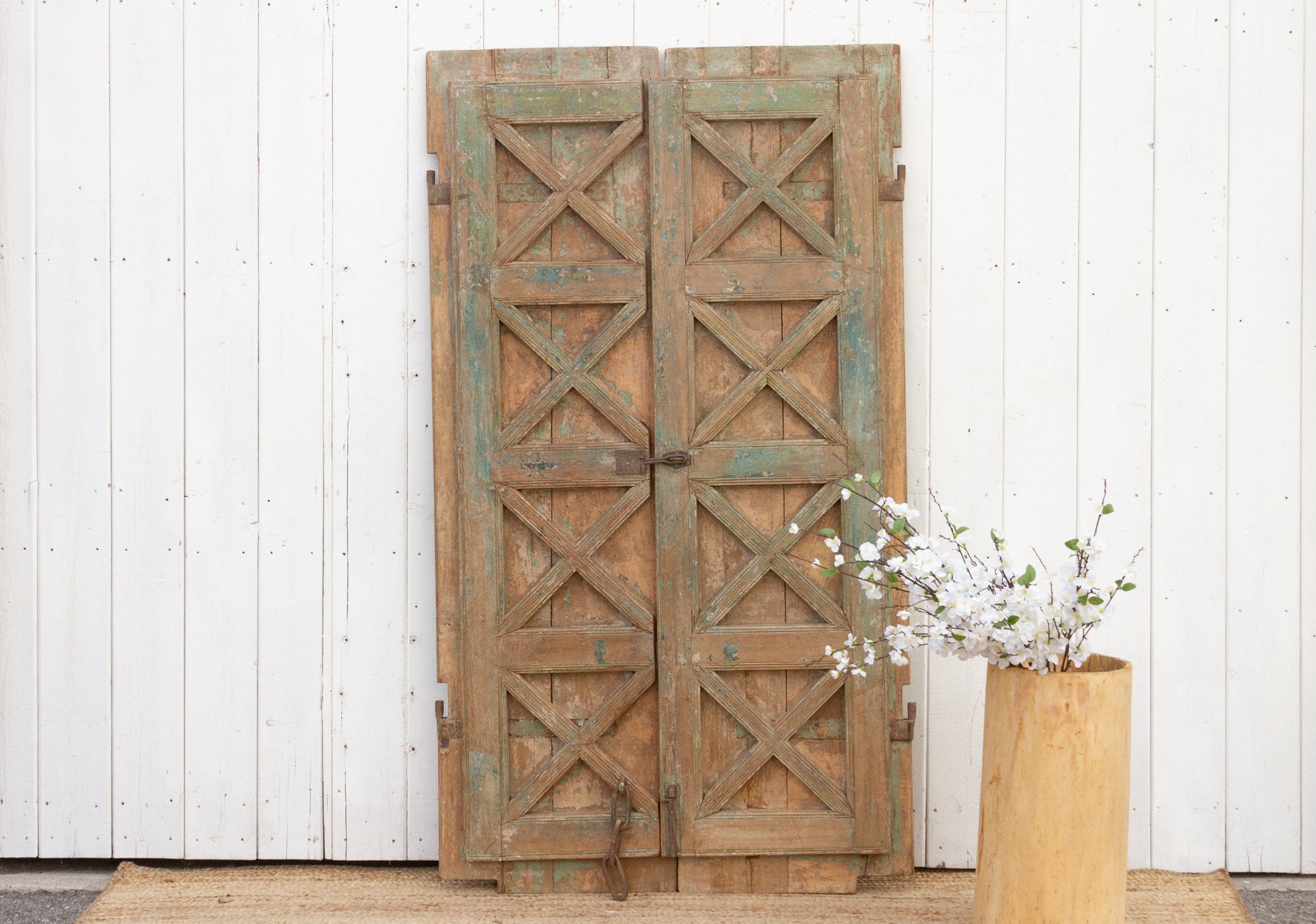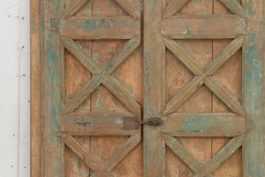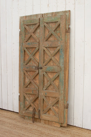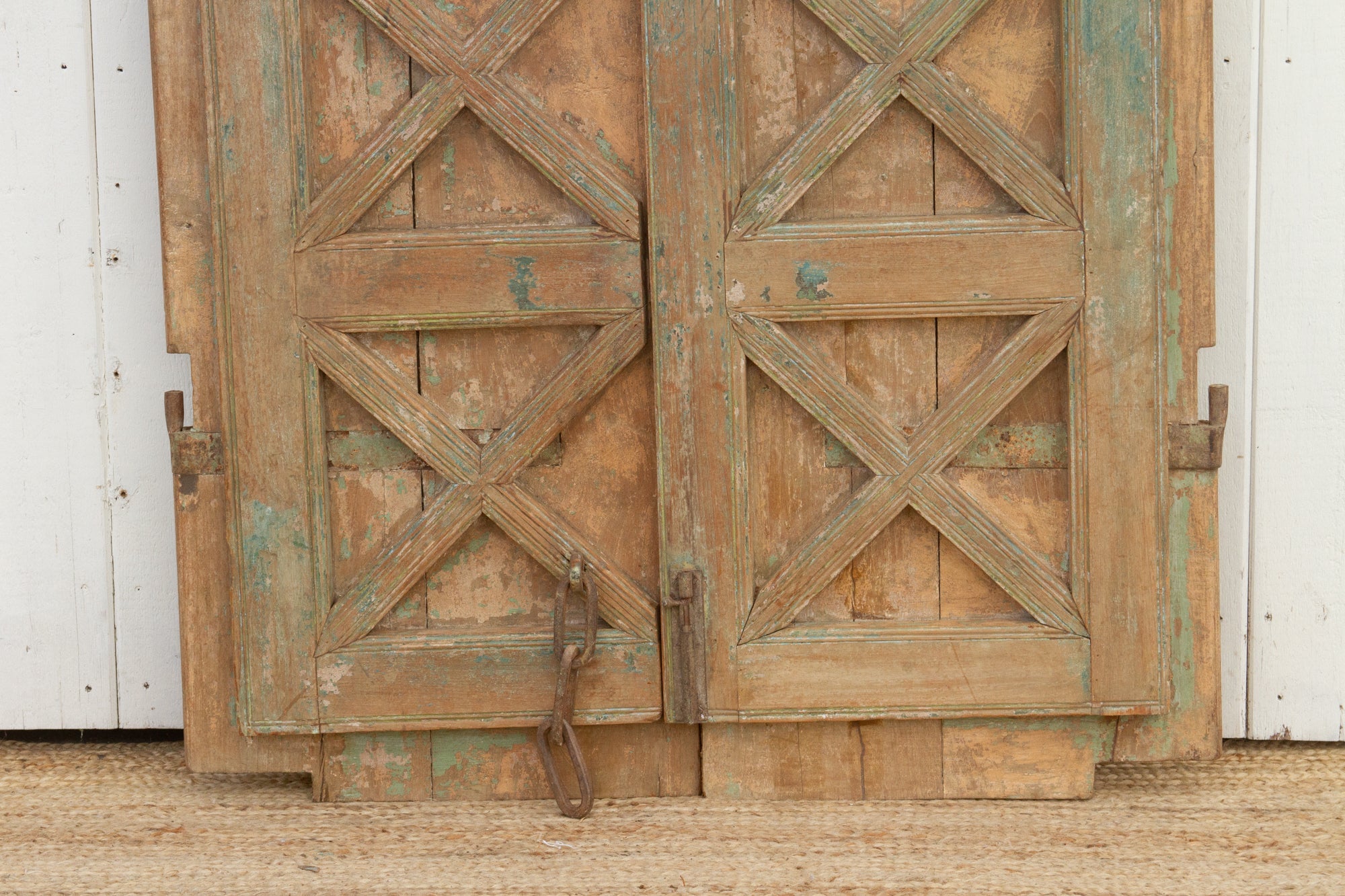 A remarkable pair of 19th century antique Indian doors, once utilized by the desert-dwelling tribes of Western Rajasthan. In their mud and clay dwellings, wood was a rarity, and these doors were crafted from solid teak, retaining their original painted finishes adorned with hues of blue, green, and brown. This rustic Indian painted pair of doors showcases an intricate geometric pattern meticulously crafted from carved cross-banded pieces of wood, adding to their allure and historical significance.