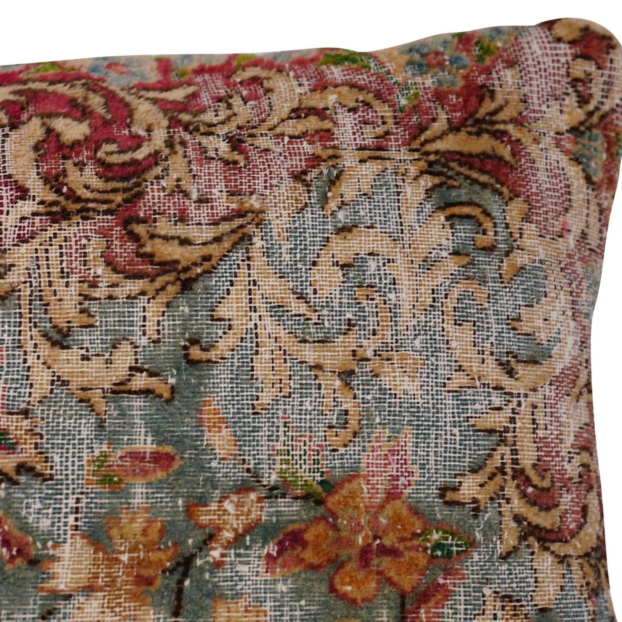 Gorgeous One-of-a-kind organic wool pillow made from a 20th-century Antique Rug. This handmade throw pillow is a beautiful and unique addition to any home decor. Made with antique vintage distressed wool rug, it adds a touch of timeless casual chic to any room. The distressed texture of the wool gives the pillow a vintage, lived-in look that adds character and warmth. Whether placed on a couch, armchair, or bed, this handmade throw pillow is sure to be a conversation piece and a favorite among family and guests.