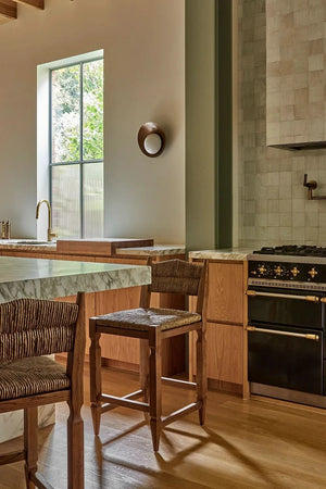 The Matisse Counter Stool is an elongated iteration of the much-loved Matisse, whose carved leg detail aligns a sculptural sensibility with the playfulness of woven textures. With a seat and chair back made from natural woven rush, this solid oak offering creates beauty and dimension at a kitchen top or counter. The Matisse Counter Stool is also available in a Dining Chair. Handmade in small batches. Limited numbers available.