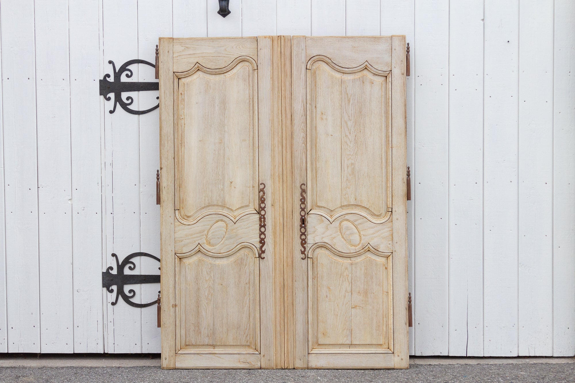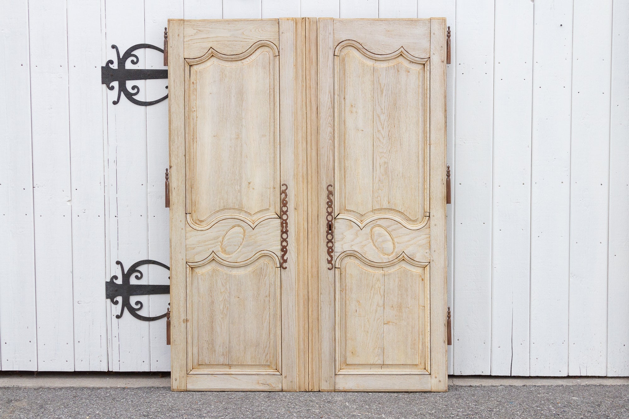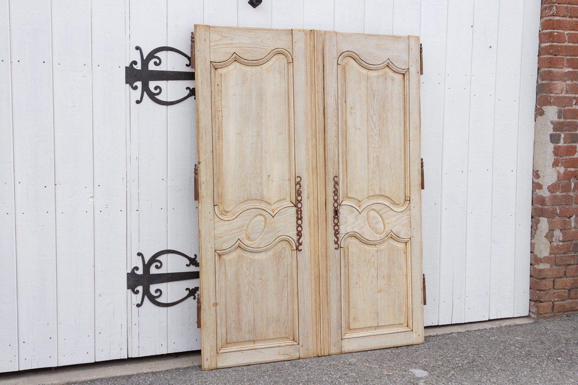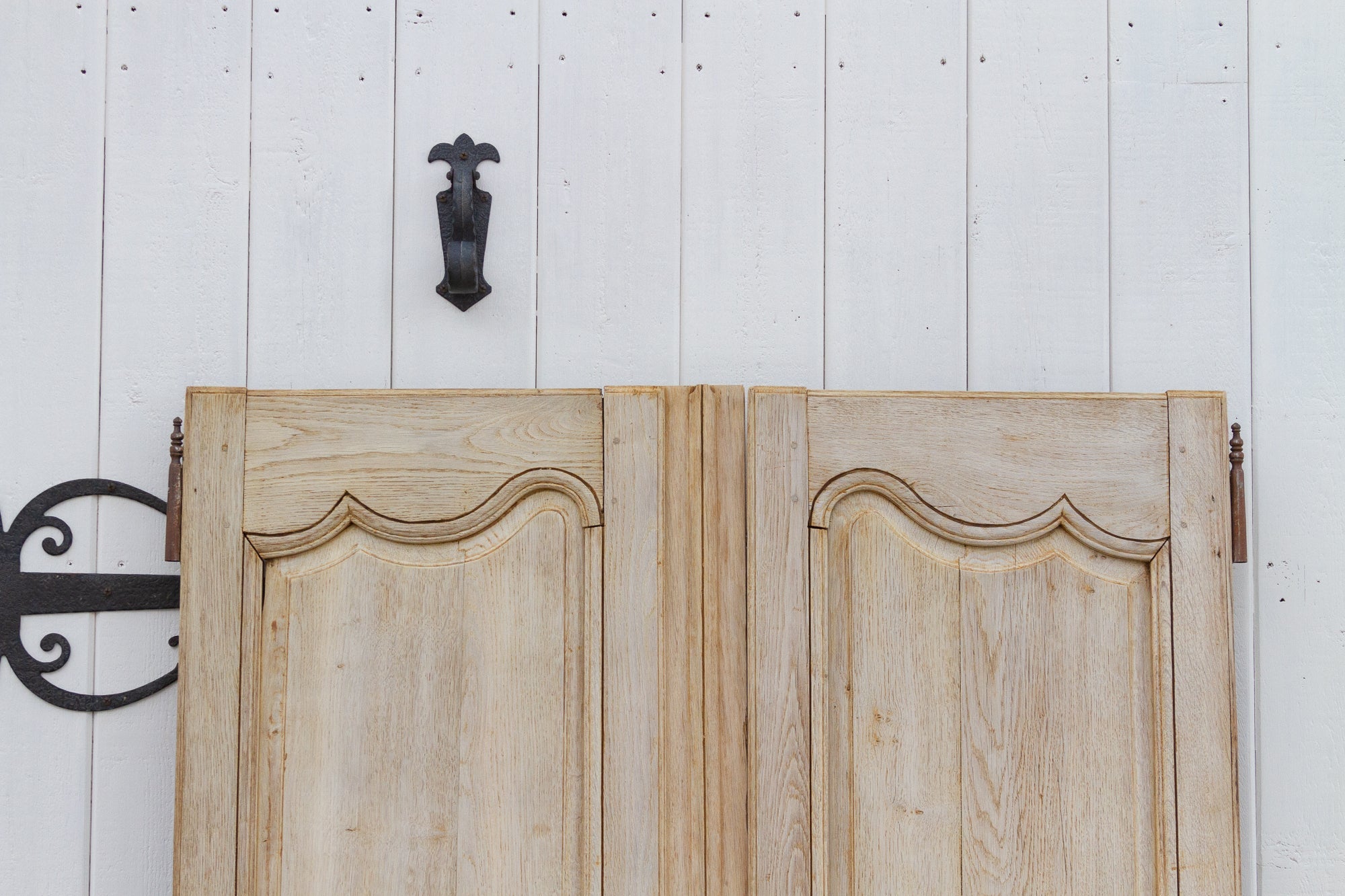 A charming pair of 19th century French oak doors with shaped paneled front. This farmhouse style pair of antique doors have a custom bleach oak finish in the front and aged light oak in the back. Originally part of an armoire, these doors will work great as closet doors, pantry doors or wall panels. Doors: 21.25"(L) x 1“(D) x 62.5"(H) and 25"(L) x 1“(D) x 62.5"(H)