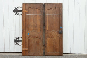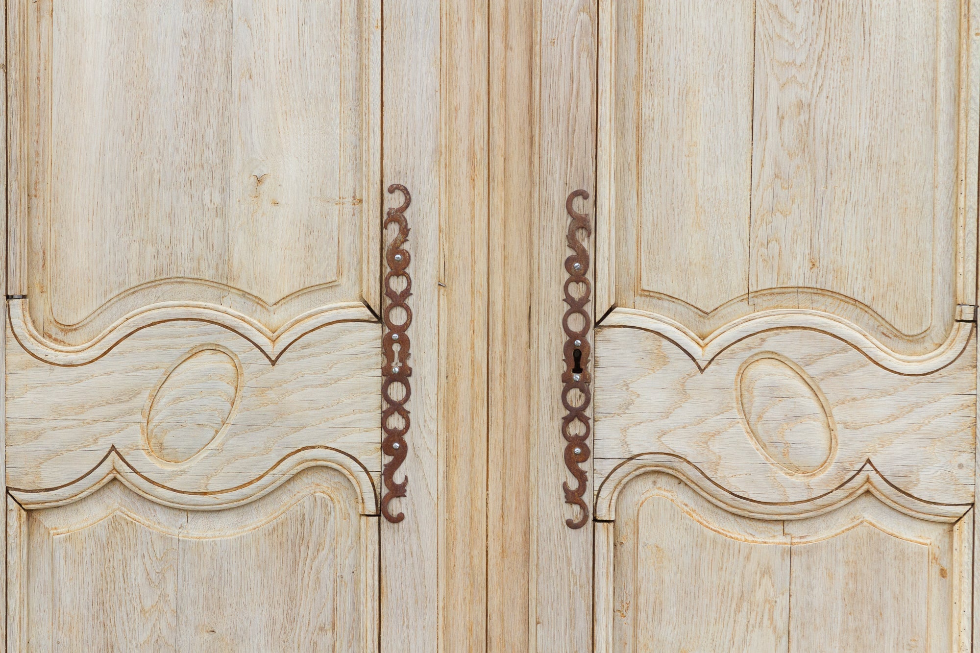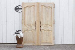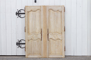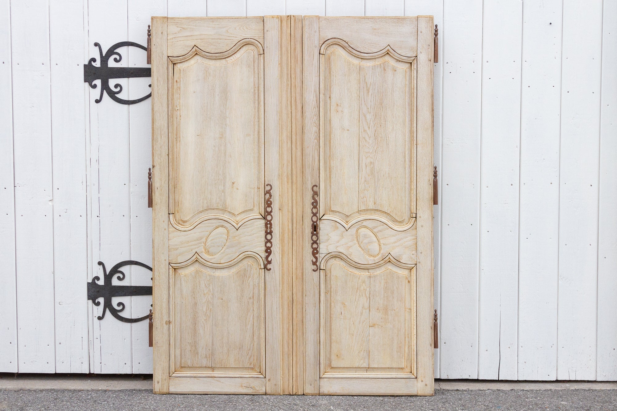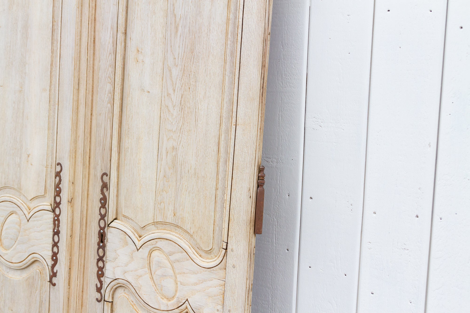 A charming pair of 19th century French oak doors with shaped paneled front. This farmhouse style pair of antique doors have a custom bleach oak finish in the front and aged light oak in the back. Originally part of an armoire, these doors will work great as closet doors, pantry doors or wall panels. Doors: 21.25"(L) x 1“(D) x 62.5"(H) and 25"(L) x 1“(D) x 62.5"(H)