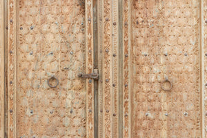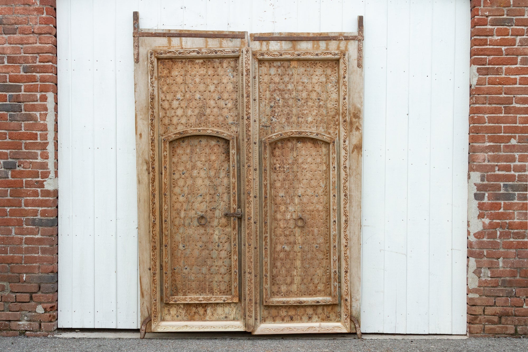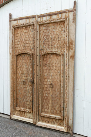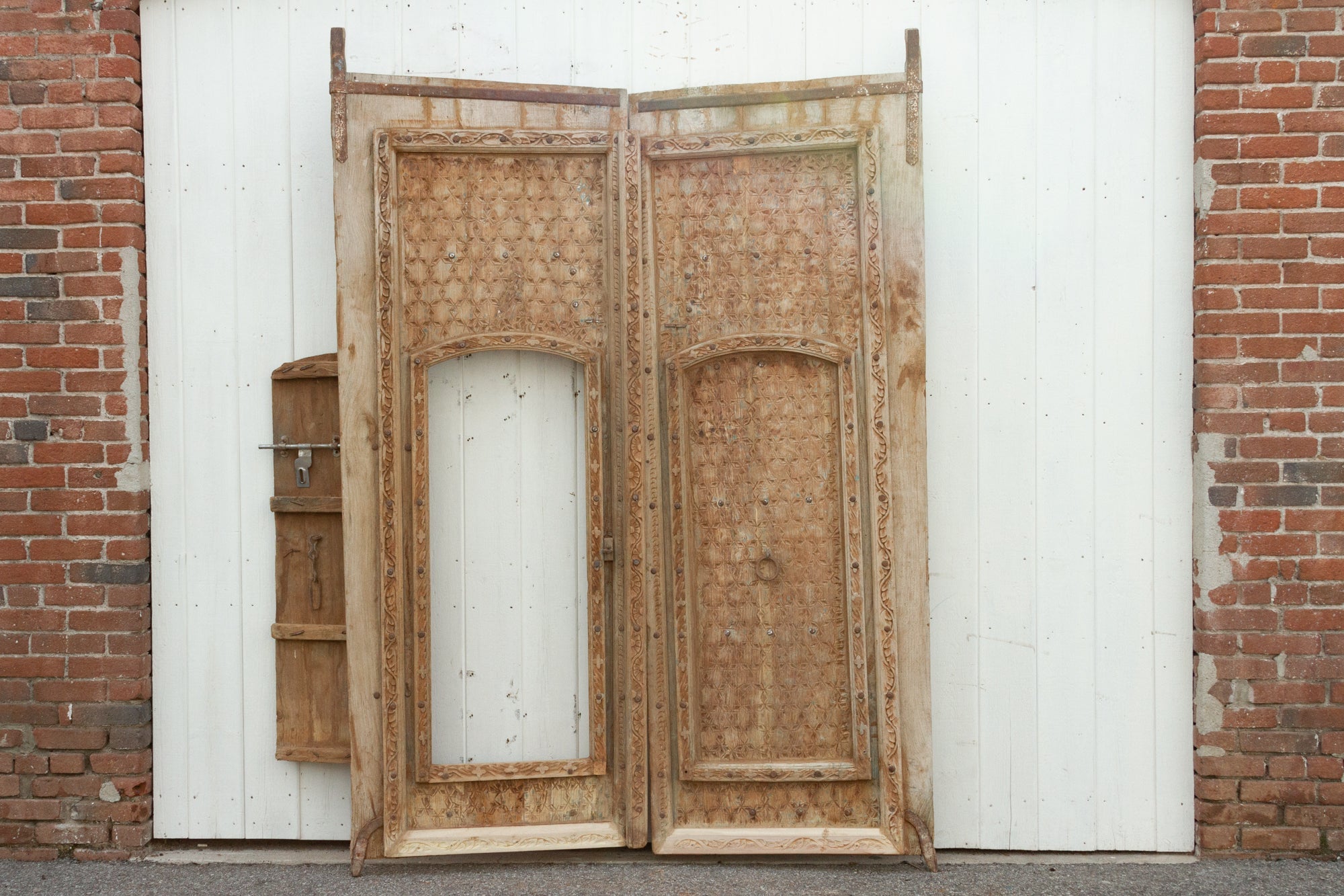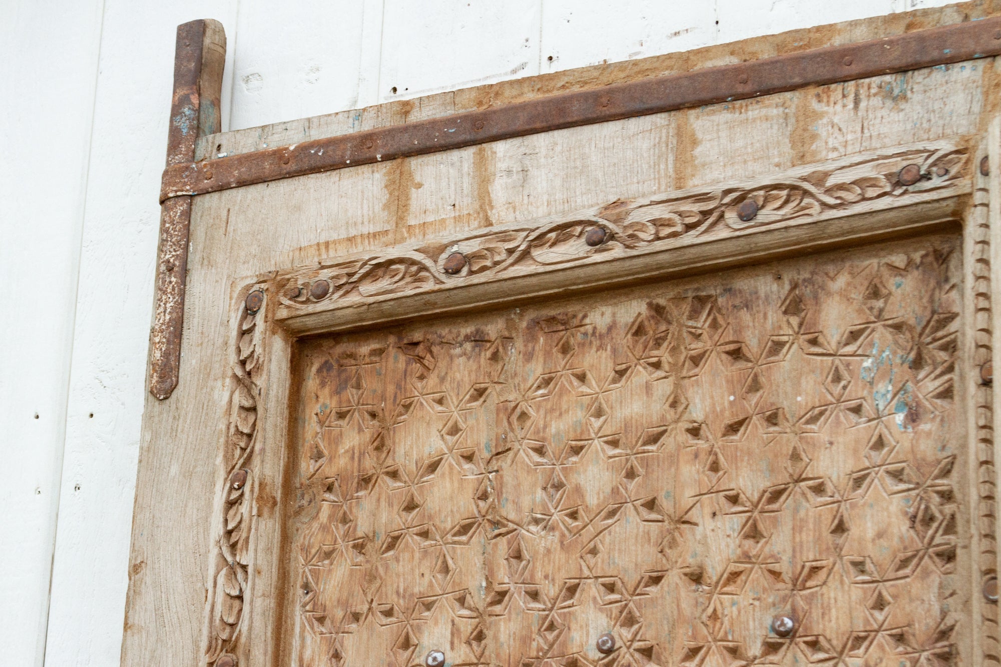 Once a fortress door in Northwest India, this beautiful pair of antique carved doors are made from solid teak wood which allowed to survive for so long. This pair of entrance doors features a beautiful carved front with Moorish star motif. This door has a small wicket gate with a semi-oxidized natural finish. A notable example of ancient Indian architecture, this antique entrance door was part of ornate palaces and forts of Rajasthan and are known for their intricate carvings and designs, which often include floral patterns, geometric shapes, and religious or mythological imagery. These beautiful doors were traditionally used in exclusive homes or temples and are highly valued for their craftsmanship, beauty, and cultural significance.