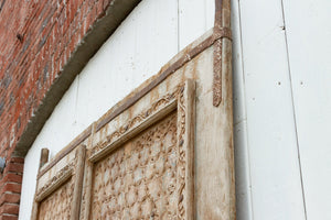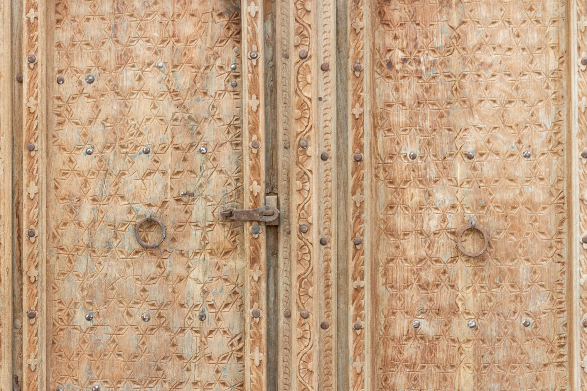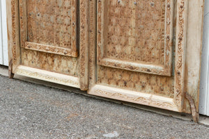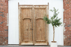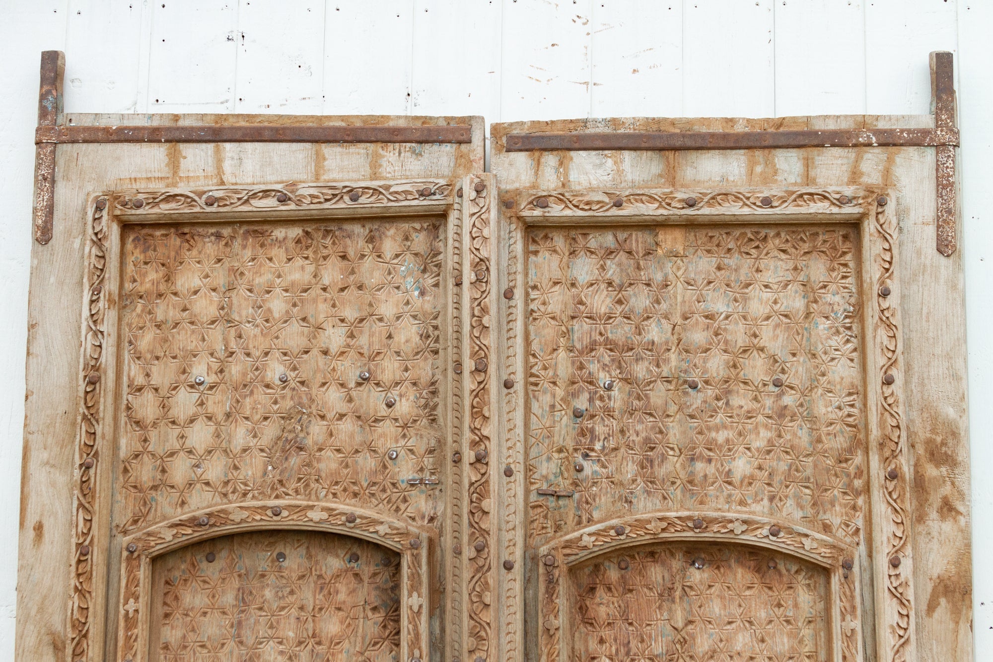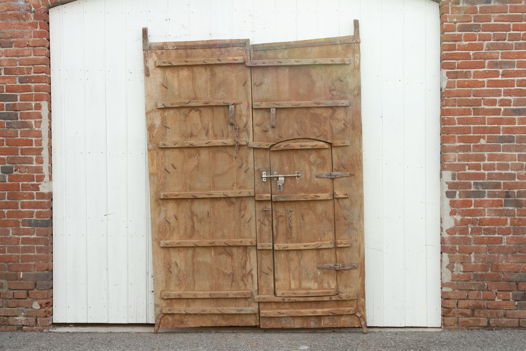 Once a fortress door in Northwest India, this beautiful pair of antique carved doors are made from solid teak wood which allowed to survive for so long. This pair of entrance doors features a beautiful carved front with Moorish star motif. This door has a small wicket gate with a semi-oxidized natural finish. A notable example of ancient Indian architecture, this antique entrance door was part of ornate palaces and forts of Rajasthan and are known for their intricate carvings and designs, which often include floral patterns, geometric shapes, and religious or mythological imagery. These beautiful doors were traditionally used in exclusive homes or temples and are highly valued for their craftsmanship, beauty, and cultural significance.