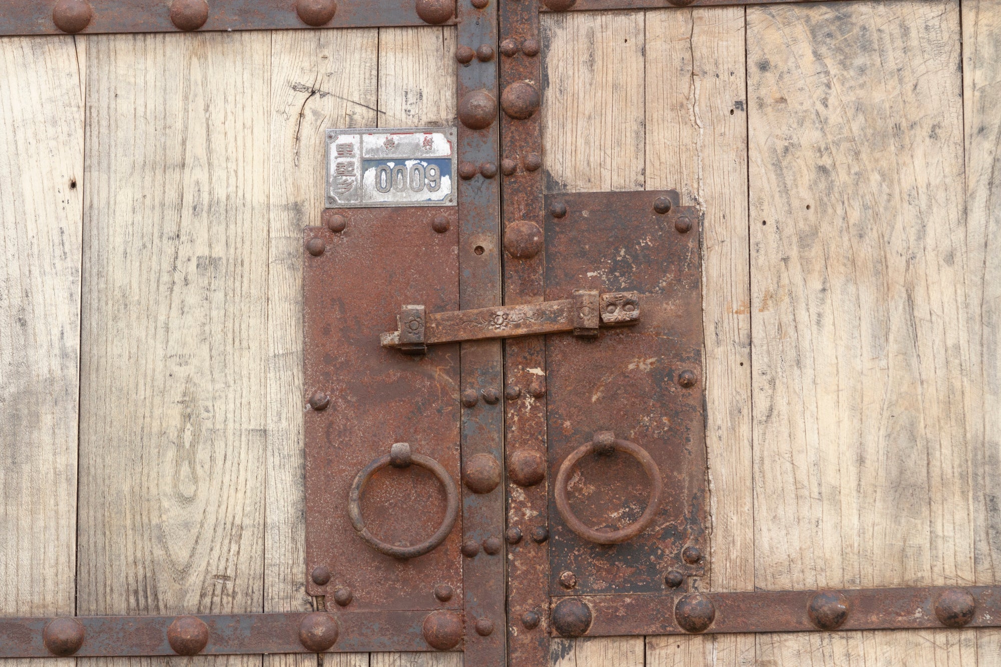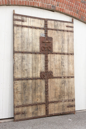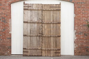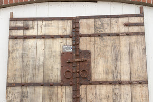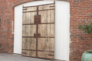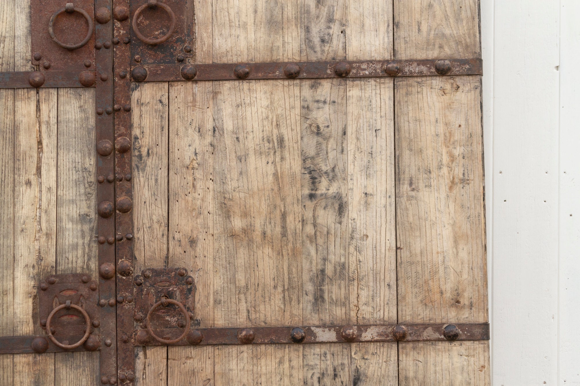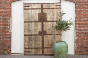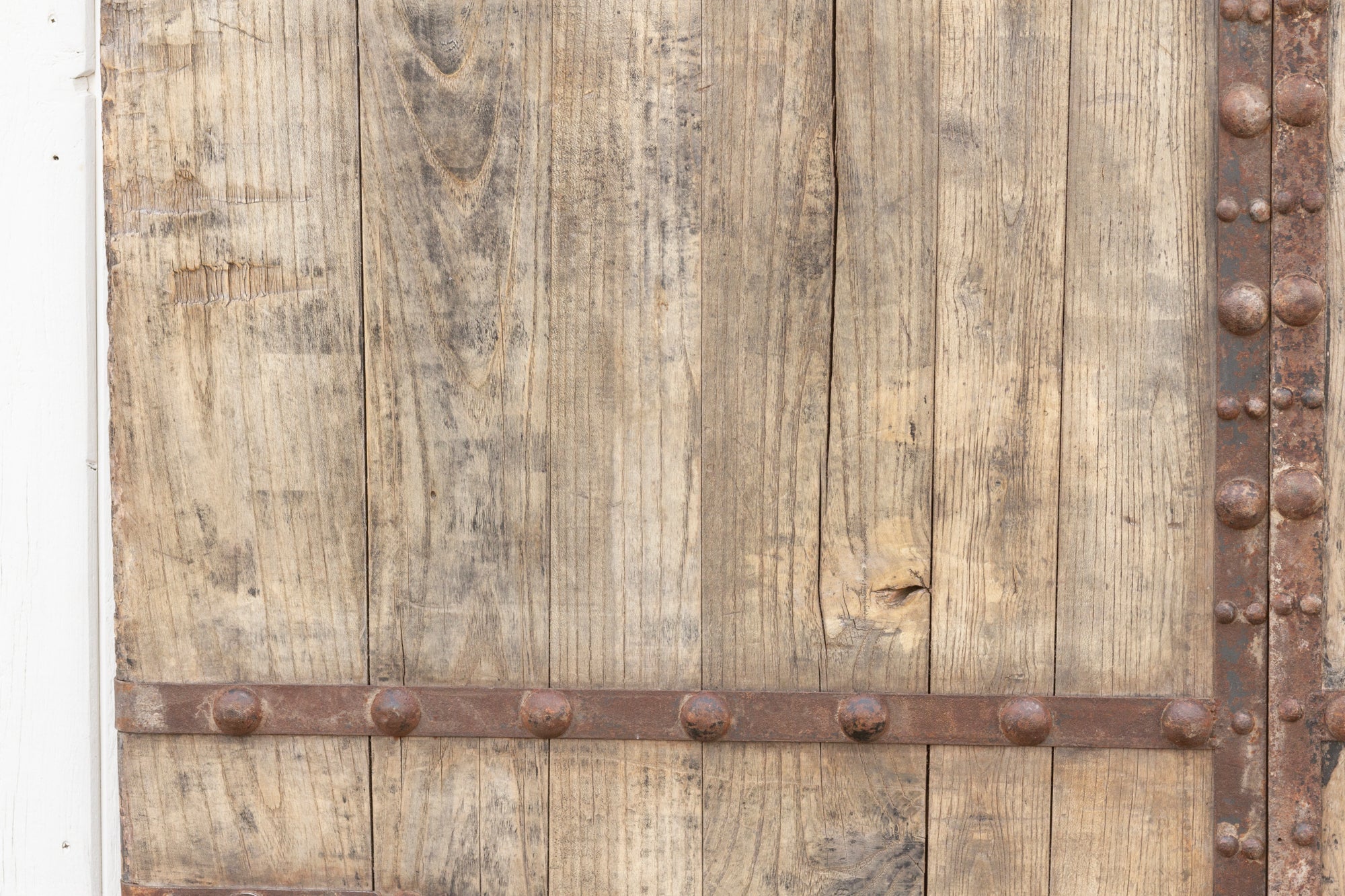 An original pair of antique Chinese doors made of elm wood with a simple yet imposing design that reflect traditional Chinese ancient architecture. This pair of antique doors was originally painted in rich, vibrant colors, and adorned with bronze or iron hardware, such as door knockers and handles. Today since they have been exposed to the elements for a long time the color has washed away, and the doors feature a lovely aged semi-oxidized finish. Antique courtyard doors are typically tall and narrow and may have several panels that can be opened and closed to reveal the room beyond. The frames are generally thick and sturdy, and the doors themselves are heavy and solid. They are often used in traditional Chinese architecture and are considered to be works of art, not just functional items.