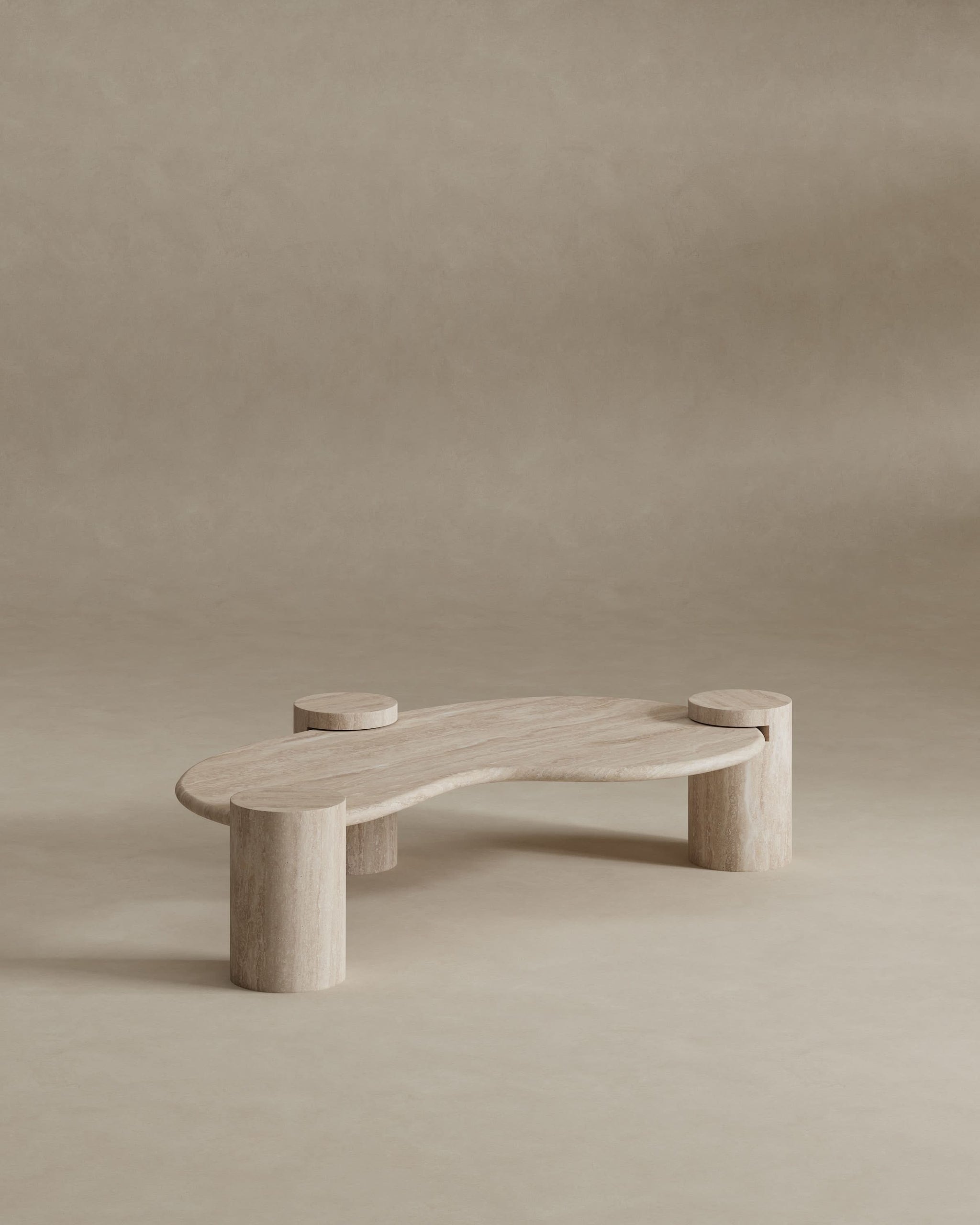 Its kidney-curved shape adds interest and intrigue. The top is secured by three round legs making it striking aesthetically. The beautiful marble-like patterning, warm earth tones, and stunning swirls of creamy hues on the travertine stone create a striking visual appeal that draws attention and adds an air of sophistication to any living space.