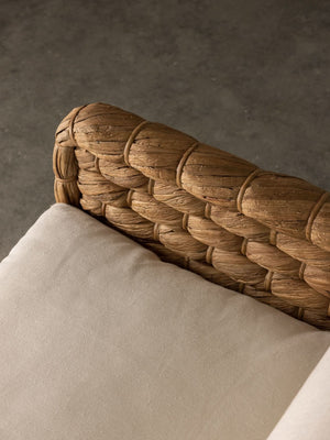 With its square rush structure, European linen, soft pillow, and curved back cushioning, the beauty and craftsmanship of this classic silhouette became a statement of quiet luxury and sophisticated comfort.