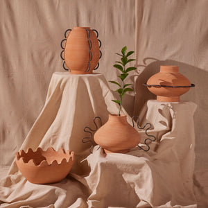 The Ines Vessels are crafted by artisans in Sabana Grande Honduras. A sculptural piece crafted sustainably and ethically by skilled craftsmen. Each piece is unique will have slight variations in dimensions and size due to its unique process. For decorative use only. ________ Terracotta + Iron ________