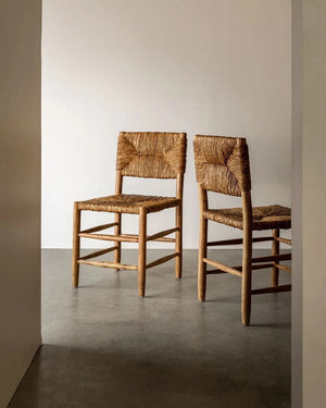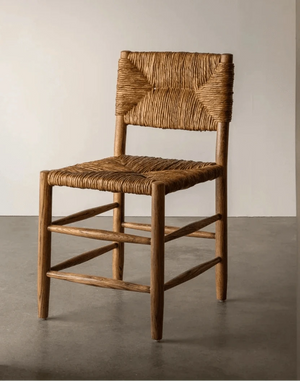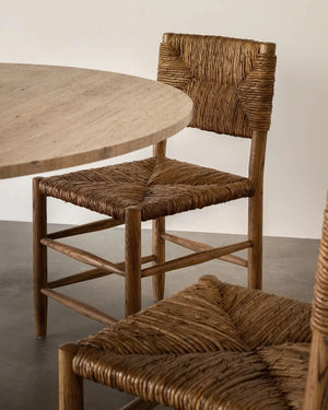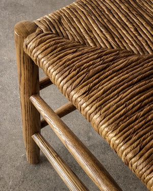 The Arnaud Dining Chair embraces a classic silhouette with its square back and angular aspects, paired with tapered carved legs and stretcher detail.  With a woven rush seat and warm oak palette, the Arnaud Chair marries function with comfort through the harmony of natural elements.