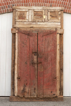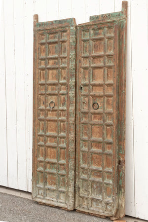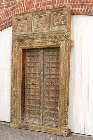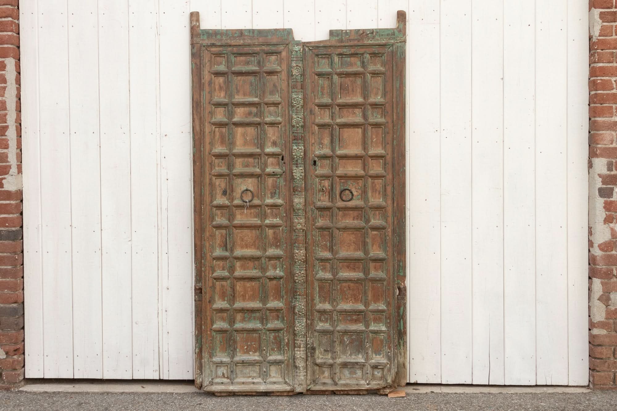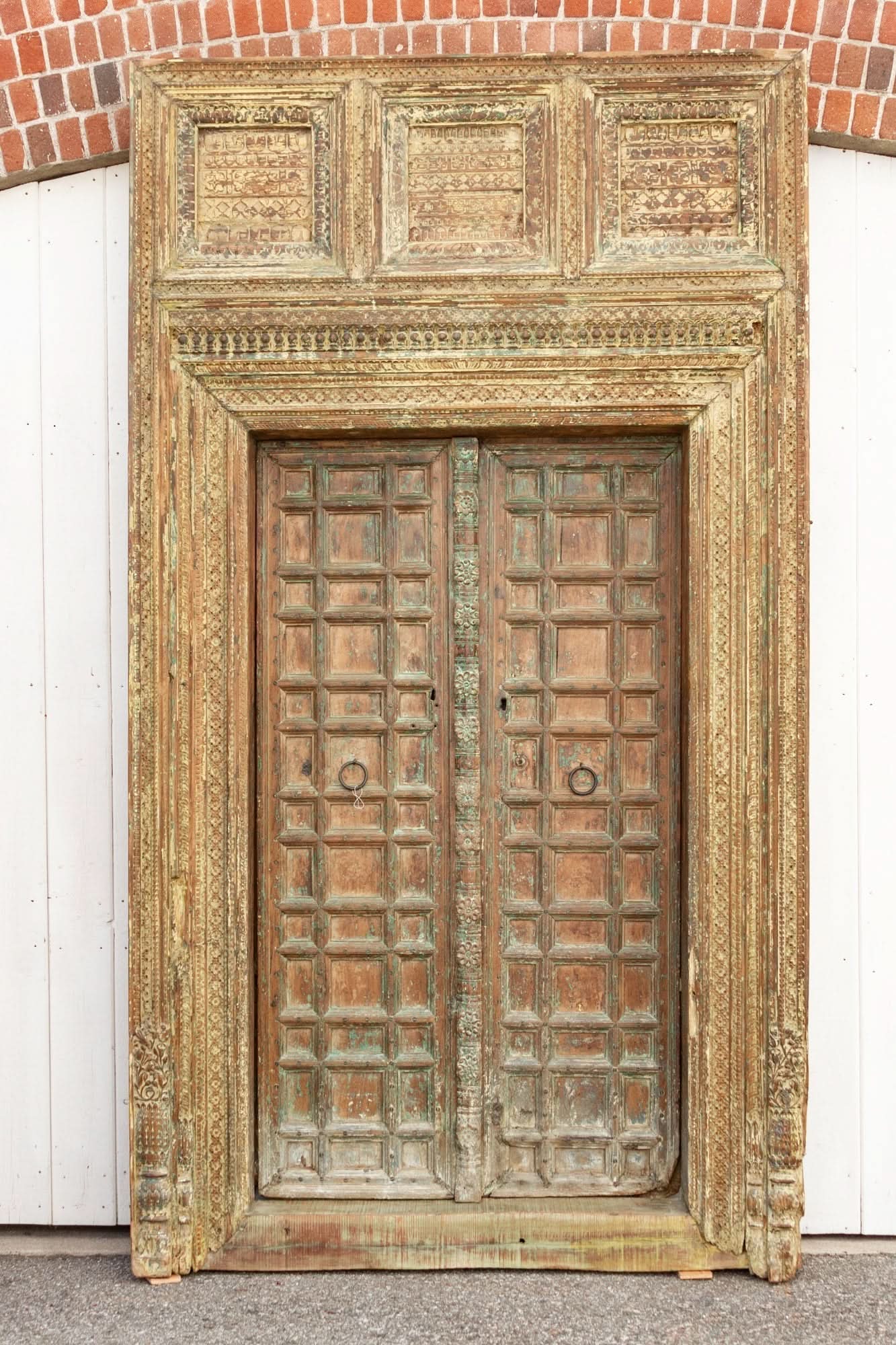 This 19th century antique, haveli Indian entrance door was originally found in Haryana in northern India. It is notable example of ancient Indian architecture, this antique entrance door was once part of ornate palaces or forts are known for being grand and decorated with a lot of delicate details. The carved details often include floral patterns, geometric shapes, and religious or mythological imagery. This pair of doors are made from thick teak wood and shows traces of original painted finish including a cream color on the frame and aged green on the actual door. The architectural surround on this door has a carved moulding frame, with floral decoration all around with tribal and geometric carved panels on top. The interior doors have a multi paneled front with a center carved floral strip in the center. These beautiful ancient doors were traditionally used in exclusive homes or temples and are highly valued for their craftsmanship, beauty, and cultural significance.