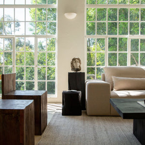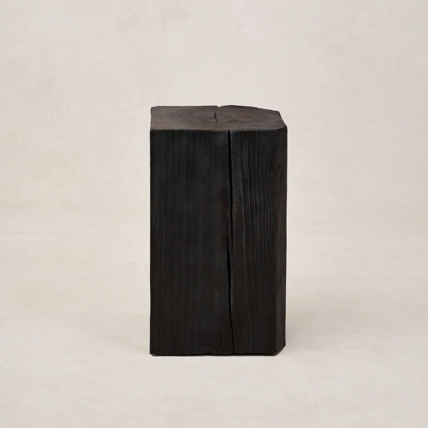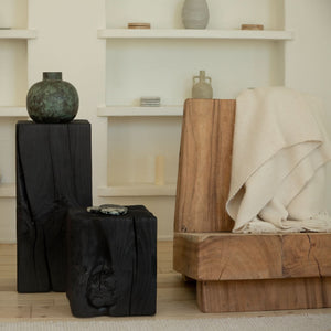 Sculptural in its own right, the Charcoal Sculpture Pedestal, crafted from solid Douglas Fir, undergoes the ancient shou-sugi-ban technique, revealing deep grooves and textures that evolve with time. As it ages, the wood tells its own story, expanding and shifting, showing hints of the natural grain beneath its burnished surface. Raw, organic, and unapologetically bold, this piece brings a sense of wild beauty into your home, letting nature take center stage.