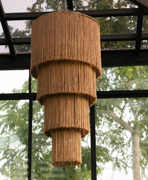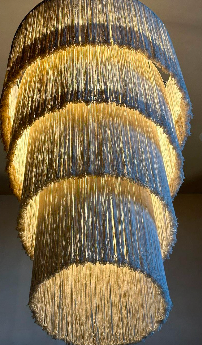 Pendant lamp with fringes and tiers, featuring a black wrought iron structure and natural colored nylon threads, handwoven and welded. Electrical not included.