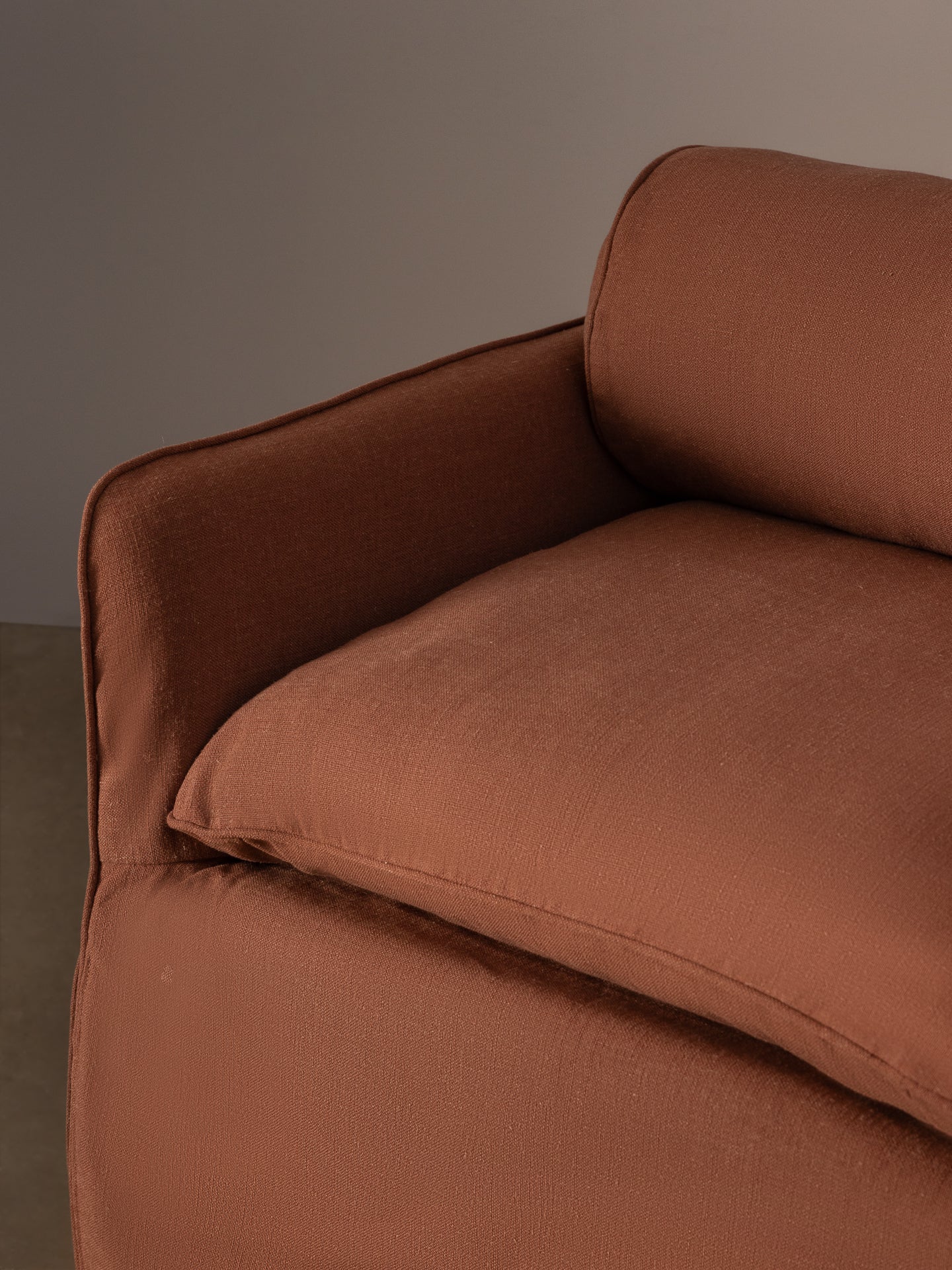 With its plush curved-back pillow and contrast velvet piping, comfort and style are married with the practicality of linen blend fabrication, for easy cleaning as required.
