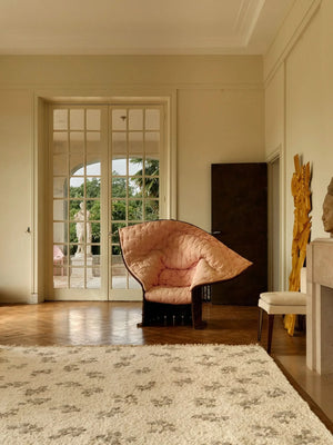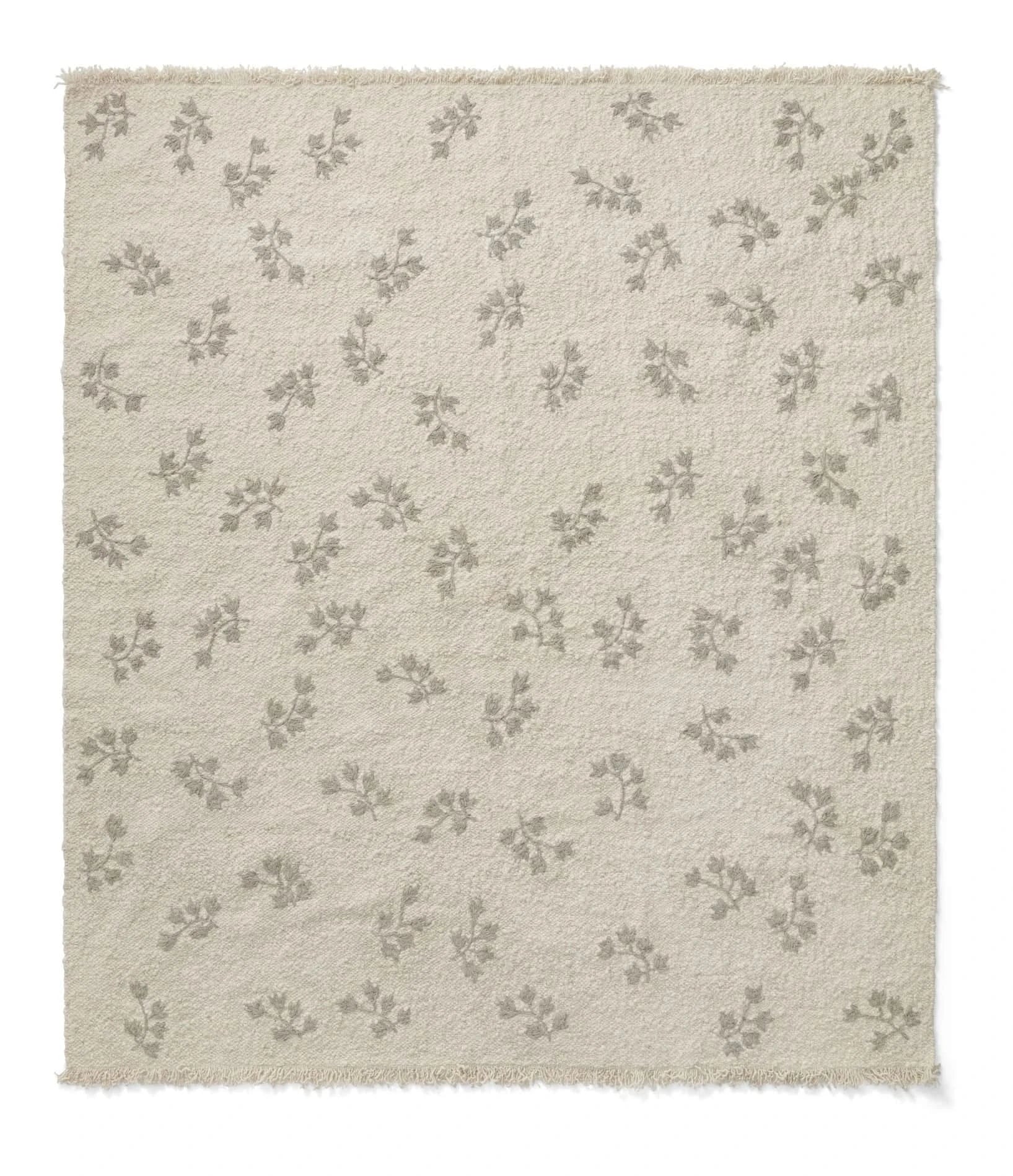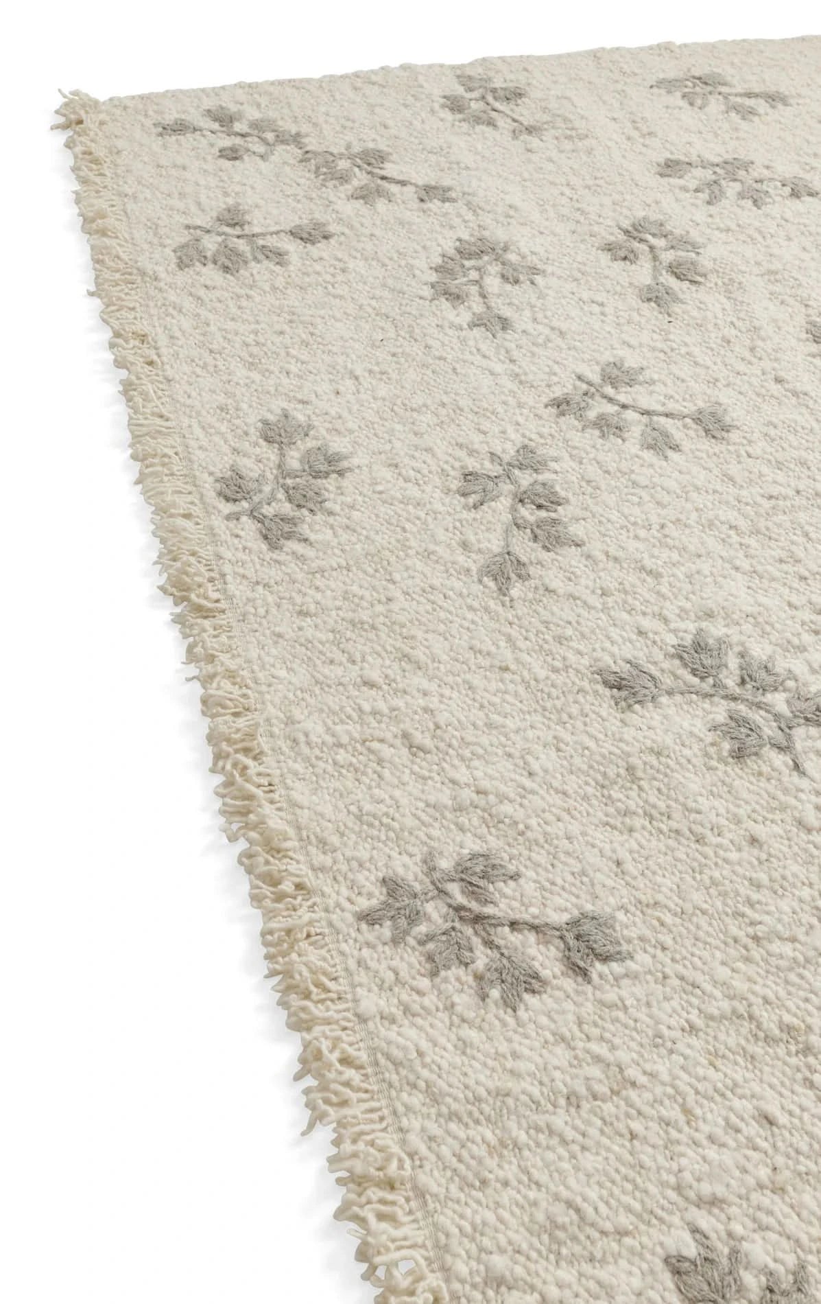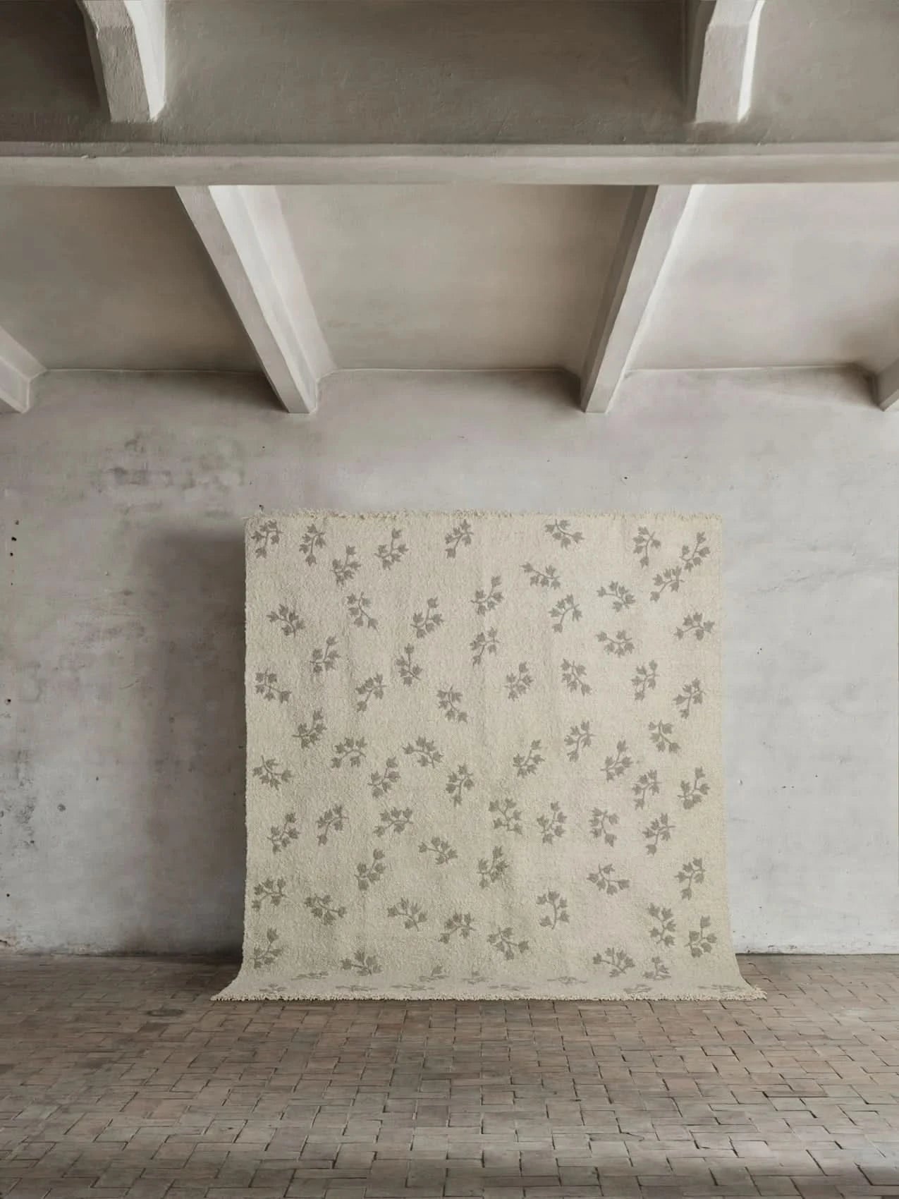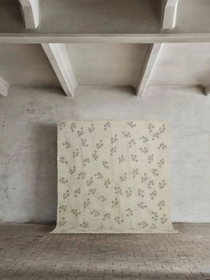 Rug no.16 is made in natural New Zealandwoolwithhandspunslubyarn, creatinga irregularfoundation. No.16 is designed in a chalky off-whiteshadewith a floralmotifportraying an interpretation of the Frenchlily.Eachrug is glidedwith hand-embroideredflowers, so everyflowerbearsitsunique charm, adding an element ofauthenticity and individuality to the design.