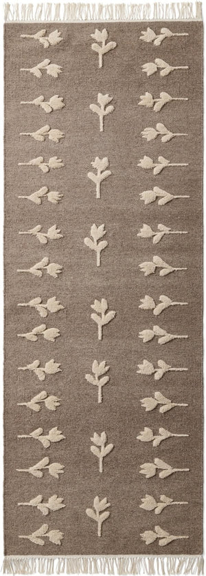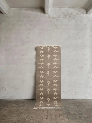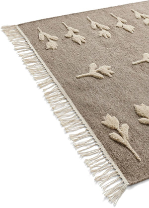 Colonnade no.09 is a grey-brown flat-woven rug with light beige hand-knotted floral pattern which gives a slightly high-and low effect, made in natural wool. The flower design draws inspiration from ancient Scandinavian tulip-patterns and brings forth a homage to these roots. A light fringe row decorates the edges, providing a simple but important detail to the overall design.